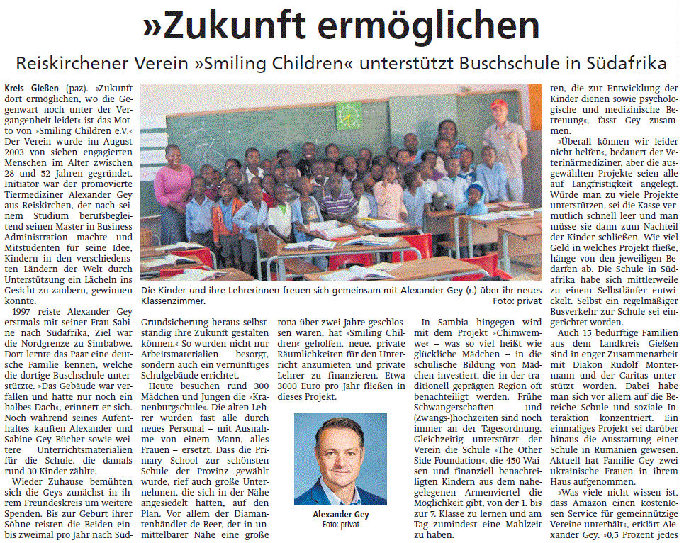 wir stehen kurz vor unserem 20jährigen Jubiläum und können mit Stolz auf viele erfolgreiche Jahre und Projekte zurückblicken. Darüber berichten wir Ihnen regelmäßig im Smiling Children Newsletter sowie via unserer Internetseite www.smiling-children.org.